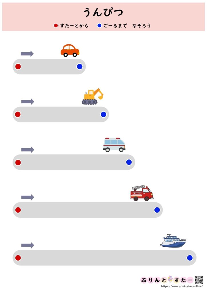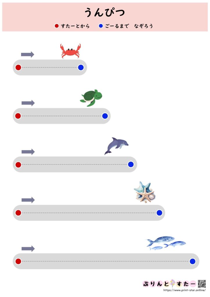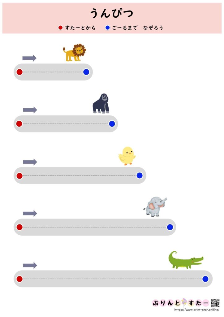 紙の上に並んだ「●点」から「●点」までを横にまっすぐ結ぶことで、えんぴつの持ち方や手の動かし方に慣れることができます。