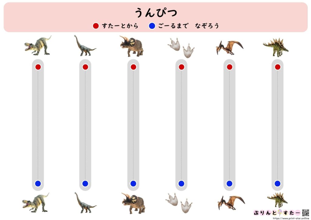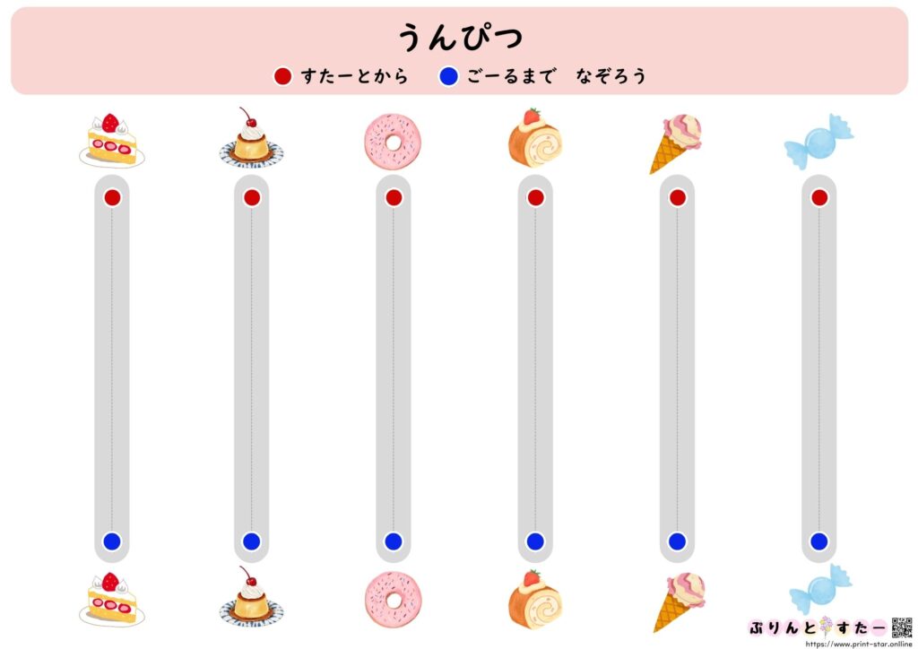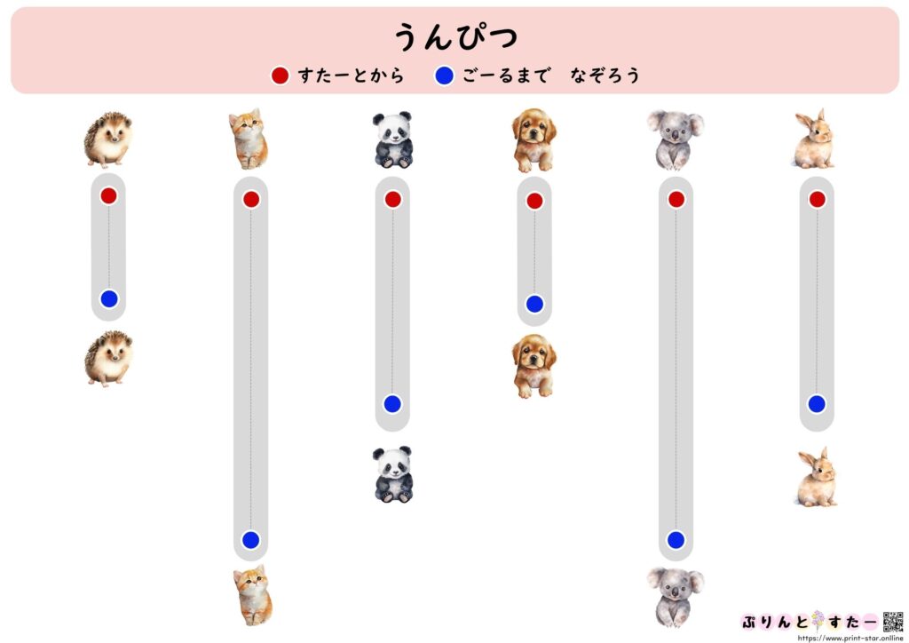 紙の上に並んだ「●点」から「●点」までを縦にまっすぐ結ぶことで、えんぴつの持ち方や手の動かし方に慣れることができます。